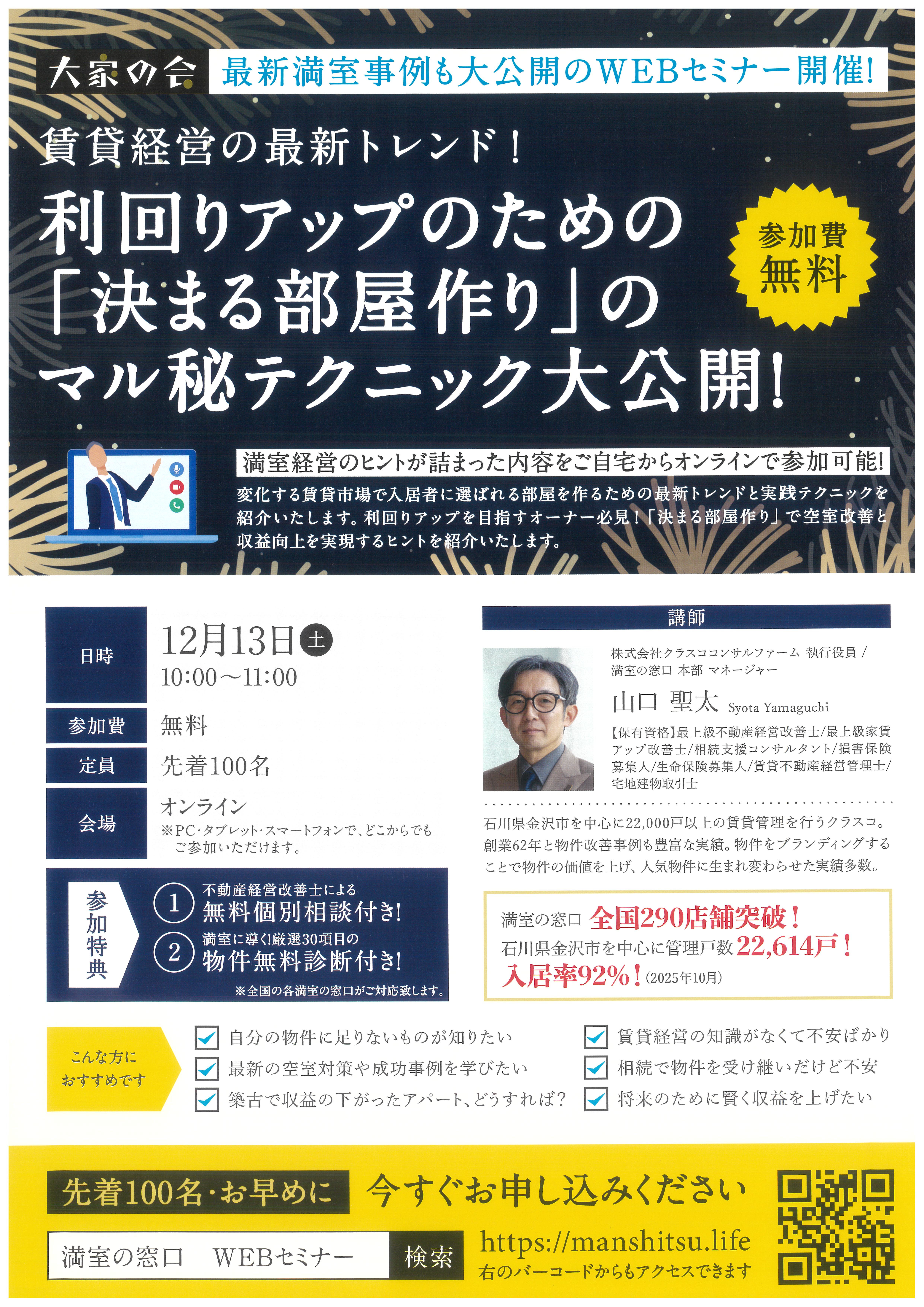 WEB無料セミナー 利回りアップのための「決まる部屋作り」のマル秘テクニック大公開!